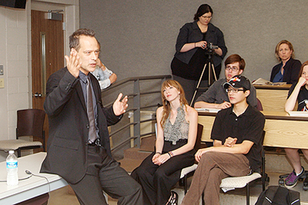 Combat journalist and best-selling author Sebastian Junger speaks to a group of MTSU students in the Bragg Mass Communication Building March 20. Junger also offered a lecture, “Dispatches from War: Stories from the Front Lines of History,” to an appreciative Tucker Theatre audience during his daylong visit to campus. (MTSU photo by Lynn Adams)