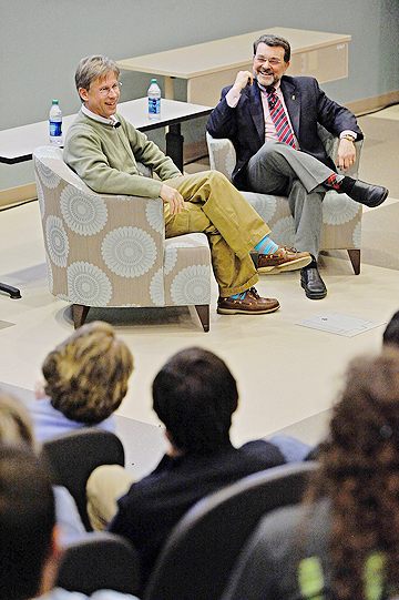 Dan O’Shannon, executive producer and writer for ABC’s “Modern Family,” laughs with MTSU professor Dr. Bob Pondillo during O’Shannon’s visit to MTSU for the Tom T. Hall Writer’s Series on April 11. (MTSU photo by Andy Heidt)