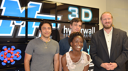 MT 3-D hyperwall grand-opening presenters Julian Harbehband, left, Olukemi "Kemi" Jolayemi, front, and Chris Irwin are joined by Dr. Anatoliy Volkov at the VizLab unveiling. Presenter J.J. Lay is not pictured. (MTSU photos by News and Media Relations)