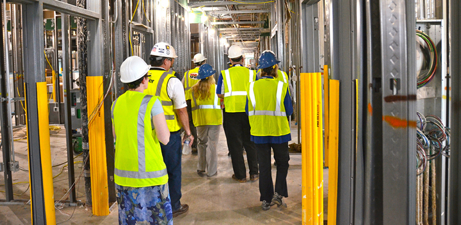 Turner Construction Co. workers point out interior features during a brief building tour for Dr. McPhee and other university staff members.