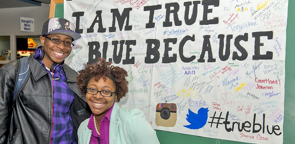 MTSU students Brian Didlake, a junior broadcast journalism major, and Briana Williams, a senior entrepreneurship major, were among dozens of students who signed the ‘I am True Blue because’ banners Tuesday inside the Keathley University Center. (MTSU photos by Darby Campbell)