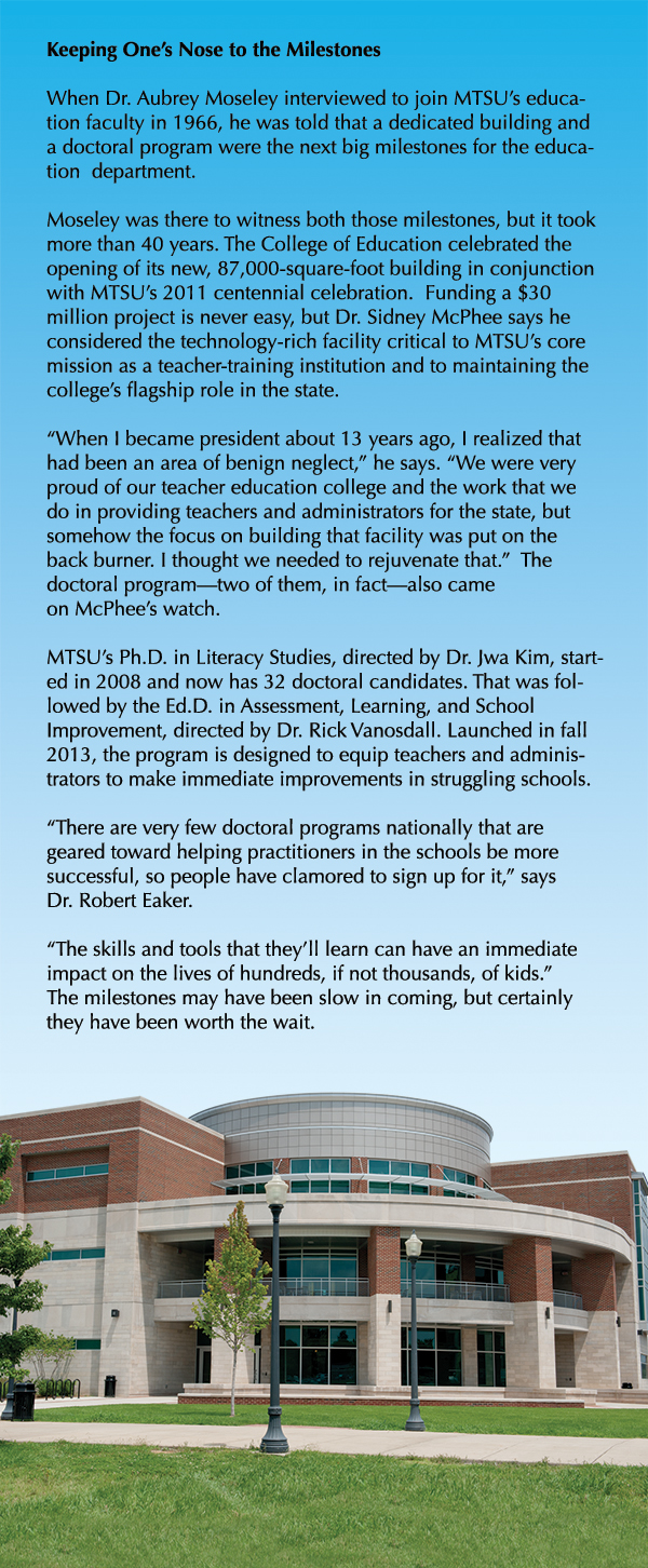 Dr. Robert Eaker, who served as dean of education and then interim vice president and provost of MTSU, credits the influence of key University administrators—former MTSU president Sam Ingram was Tennessee commissioner of education, as was Lana Seivers under Gov. Phil Bredesen— as well as education faculty past and present who are leaders in their field. “I think of our milestones in terms of the giants in education that Middle’s been blessed to have,” Eaker says. He says President Sidney McPhee upped the ante by supporting the establishment of COE’s two doctoral programs as well as a state-of-the-art COE facility that had been on the college’s wish list for decades.
