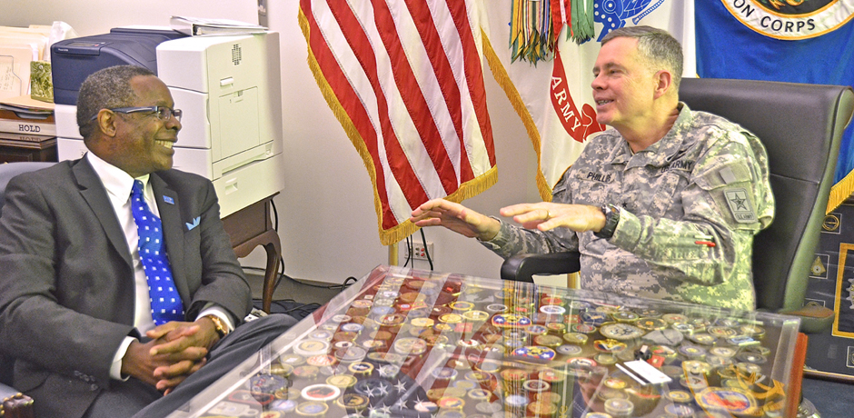 MTSU President Sidney A. McPhee (left) meets with Lt. Gen. William Phillips during a visit to the Pentagon’s offices for the Army Acquisition Corps. Phillips will be the afternoon speaker for the May 10, 2014, commencement ceremony and will be presented with an honorary doctorate degree. (MTSU photo)