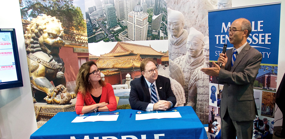 In a ceremony featuring traditional Chinese music, dancers and a man in a giant panda suit, leaders of the Discovery Center at Murfree Spring and MTSU signed a pact Friday, Sept. 26, that they hope will lead to future cultural collaborations.