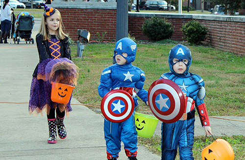 A stylish witch and twin Captain Americas prowl MTSU’s Greek Row for treats during the 2013 “Trick-or-Treat on Greek Row” Halloween event. This year’s free public event for area youngsters 12 and under is set for Oct. 30. (photo courtesy of MTSU Fraternity and Sorority Life)