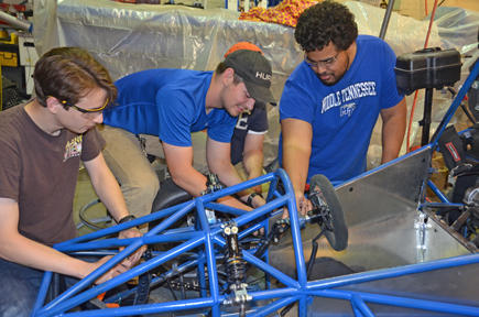 MTSU seniors Thomas Kenney, Beau Hallavant and Zach Hunter make front-end adjustments to the Formula Hybrid in the Voorhies Engineering Technology Building shop before traveling to Loudon, New Hampshire, for the April 27-30 competition.