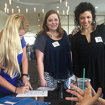 Four of MTSU’s newest faculty members take a moment to learn more about getting publicity for their students’ work and their own during New Faculty Orientation Day Tuesday, Aug. 18, in the lobby outside the Student Union ballroom. Dr. Heather Rhodes, center, a new full-time member of the Department of Economics and Finance, and professor Meena Khalili, center right, a new addition to the Department of Art, listen to News and Media Relations staffer Gina K. Logue, right, explain how their expertise can be used in public relations. New Jones College of Business faculty member Lucy Matthews, left, an assistant professor of marketing, joins new aerospace professor Christina Hiers, center left, in filling out contact information for future media questions. (MTSU photo by News and Media Relations)