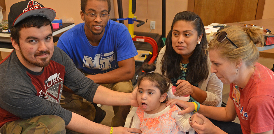 Sayetzi Ledezma, 2, in car, is shown with Hurial Ledezma, left, MTSU senior mechatronics engineering student Joshua Graham, Yorleny Mendez and Special Kids physical therapist Tessa Irwin Sept. 12 at the East Main Street facility. (MTSU photos by Randy Weiler)