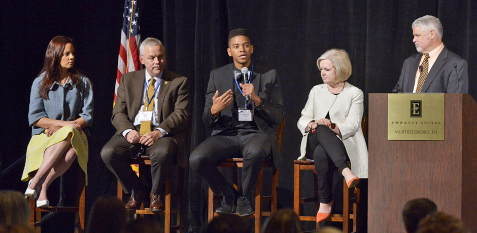 MTSU alumnus Andrew George, center, a marketing coordinator with Dale Carnegie Training of Tennessee, makes a point during a panel discussion at the MTSU 21st Century Generations@Work Conference held Friday at Embassy Suites. Pictured from left are Knight Stivender, 12th & Broad; Dan Ryan, Ryan Search and Consulting; George; Rebecca Climer, Saint Thomas Health; and moderator Matt Thornhill with GenerationsMatter. (MTSU photo by Andy Heidt)