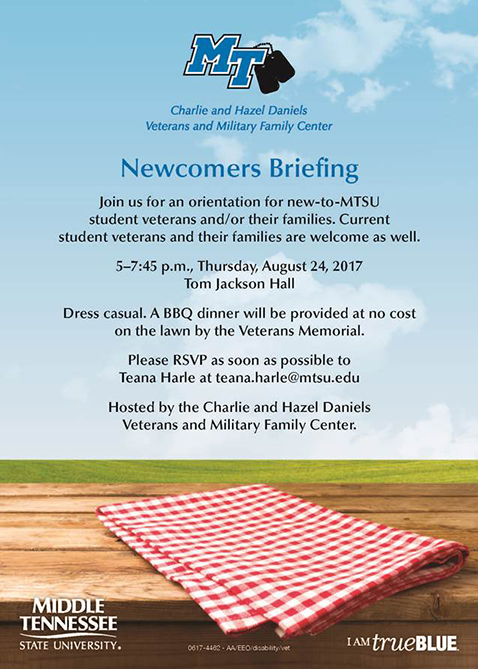 New and returning MTSU student veterans and their families are welcome to attend a “newcomers briefing” provided by the Charlie and Hazel Daniels Veterans and Military Family Center.