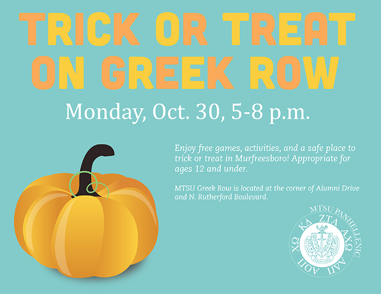 The College Panhellenic Council will host its annual Trick or Treat on Greek Row with support from some of MTSU’s sororities and fraternities from 5 to 8 p.m. Monday, Oct. 30, outside the fraternity houses located on the corner of Alumni Drive and North Rutherford Boulevard.