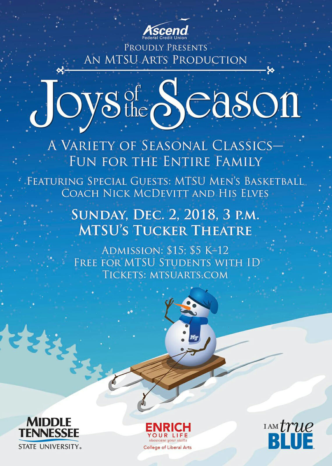 There’s little better than sharing joy with friends and family, and MTSU’s Tucker Theatre will become holiday headquarters for “Joys of the Season” once again Sunday, Dec. 2, when the university offers its annual arts celebration to the community.