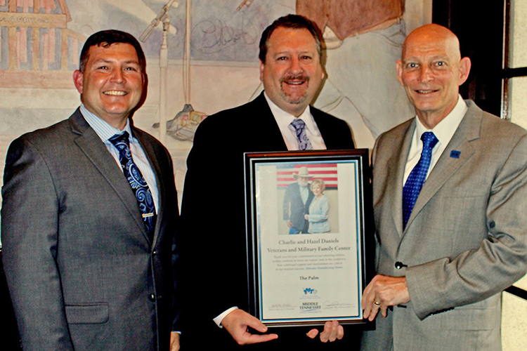 Retired Army Lt. Gen. Keith Huber, MTSU’s senior adviser for veterans and leadership initiatives, and retired Army Capt. Shane Smith, Daniels Center assistant director and employer search agent, presented a special certificate to Bryan Lytle, The Palm’s general manager.
