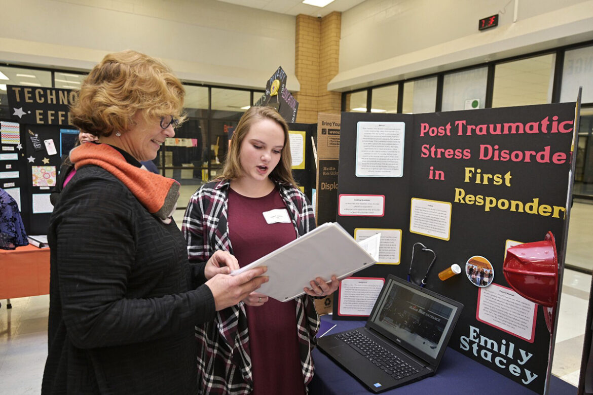 Blackman High School chemistry and physics teacher Kim Baumann, left, listens as senior Emily Stacey shares details about her “PTSD in First Responders” capstone research project March 4 in the school’s cafeteria. Stacey said she plans to attend MTSU and major in counseling and minor in psychology. (MTSU photo by Andy Heidt)