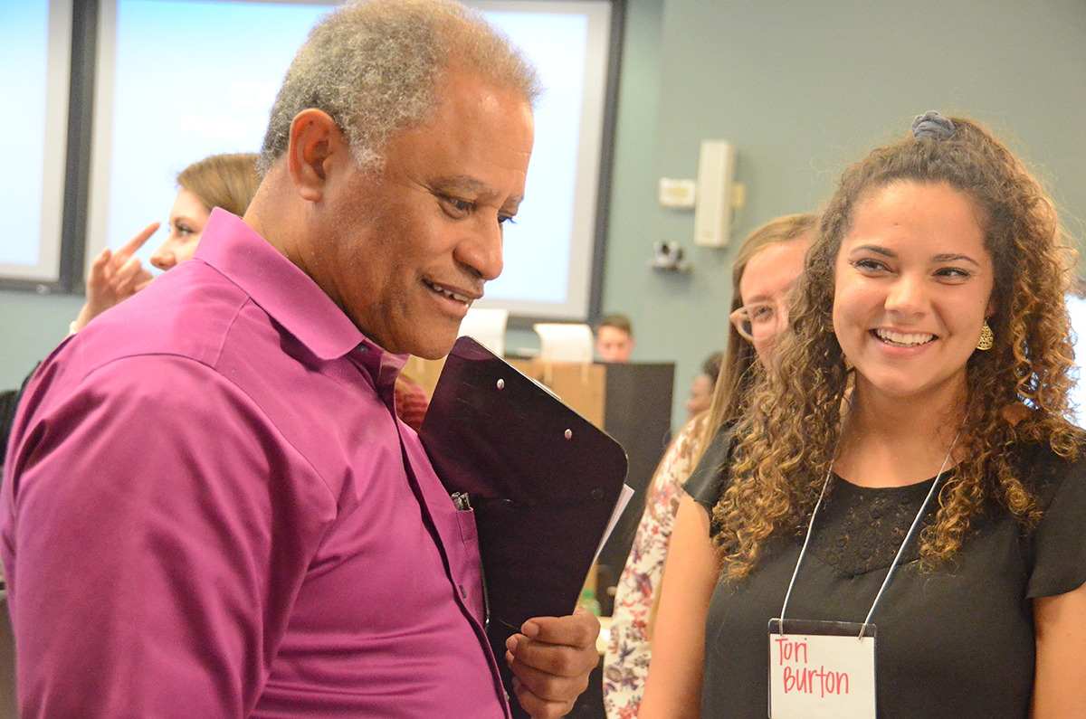 MTSU Educational Leadership professor Donald Snead, left, and junior child development and family studies major Tori Burton laugh as she responds to his question involving her group’s undergraduate research poster shown March 18 during the College of Education Scholars Day poster presentation event in the COE Building. Burton, 25, of Spokane, Wash., and four classmates combined research efforts into a poster titled “Discipline Strategy for Behavioral Disorders Through the Decades,” including the 1980s, ’90s, 2000s and 2010s. (MTSU photo by Randy Weiler)