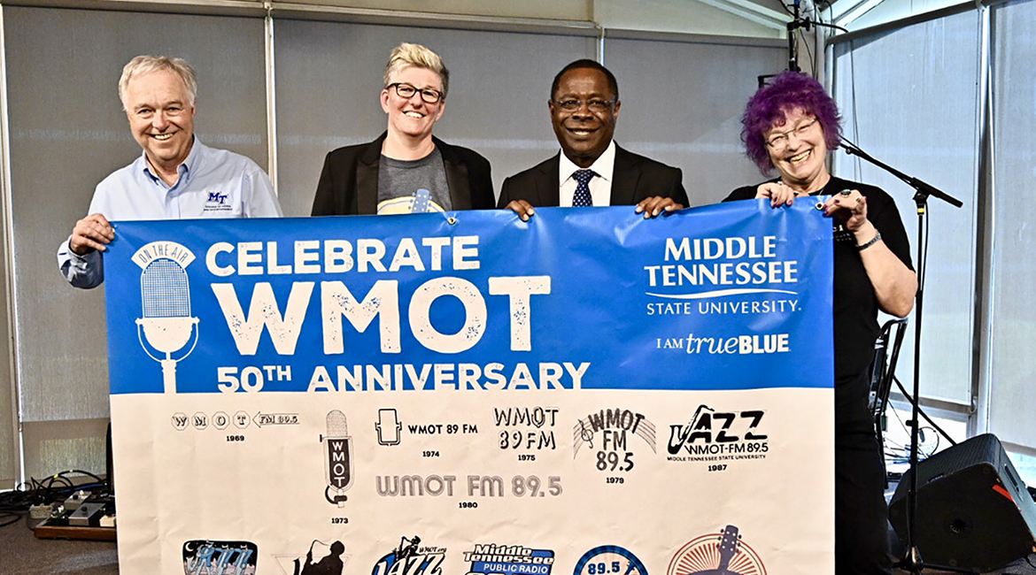 Ken Paulson, left, dean of MTSU’s College of Media and Entertainment, joins Val Hoeppner, executive director of WMOT Roots Radio 89.5, MTSU President Sidney A. McPhee and Jessie Scott, WMOT host, to display the 50th anniversary banner for the MTSU-owned station during a special celebration held Tuesday, April 9, at the Cyber Cafe on the Blue Raider campus. (MTSU photo by J. Intintoli)