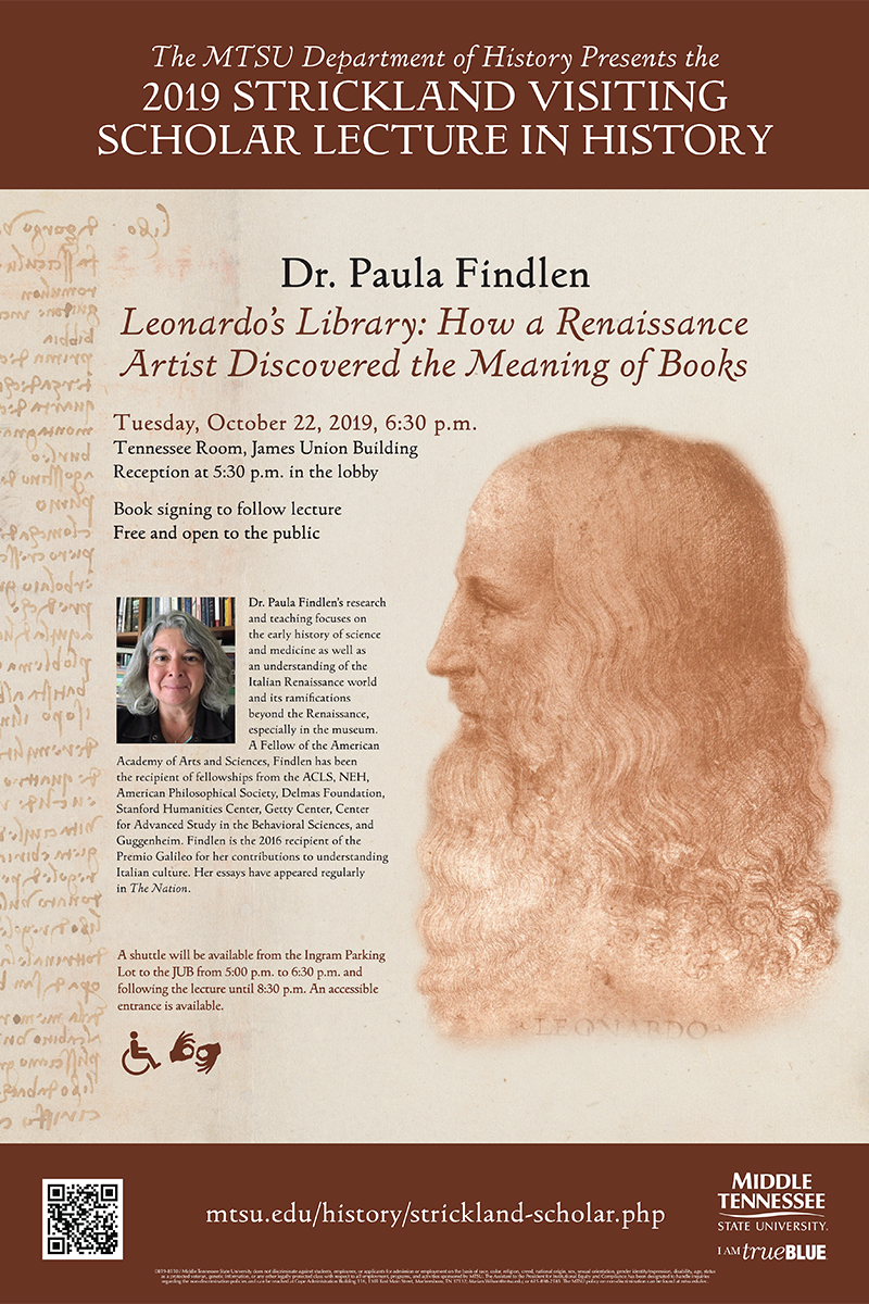 Dr. Paula Findlen, the Ubaldo Pierotti Professor of Italian History at Stanford University, will speak on “Leonardo’s Library: How a Renaissance Artist Discovered the Meaning of Books” at 6:30 p.m. Oct. 22 in the Tennessee Room in MTSU’s James Union Building, 516 Alma Mater Drive.