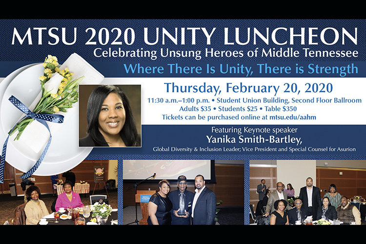 “Where There is Unity, There is Strength” is the theme of the 2020 Unity Luncheon, which is slated for 11:30 a.m. to 1 p.m. Thursday, Feb. 20, in the ballroom of the Student Union, 1768 MTSU Blvd.