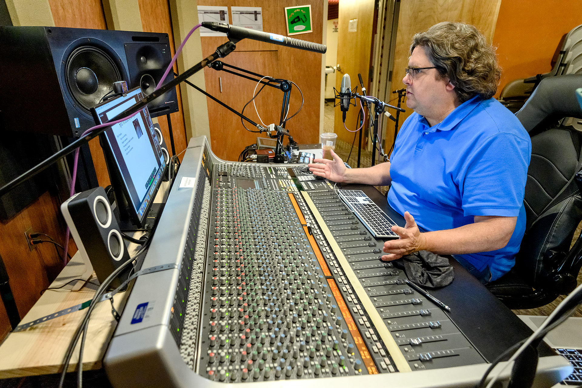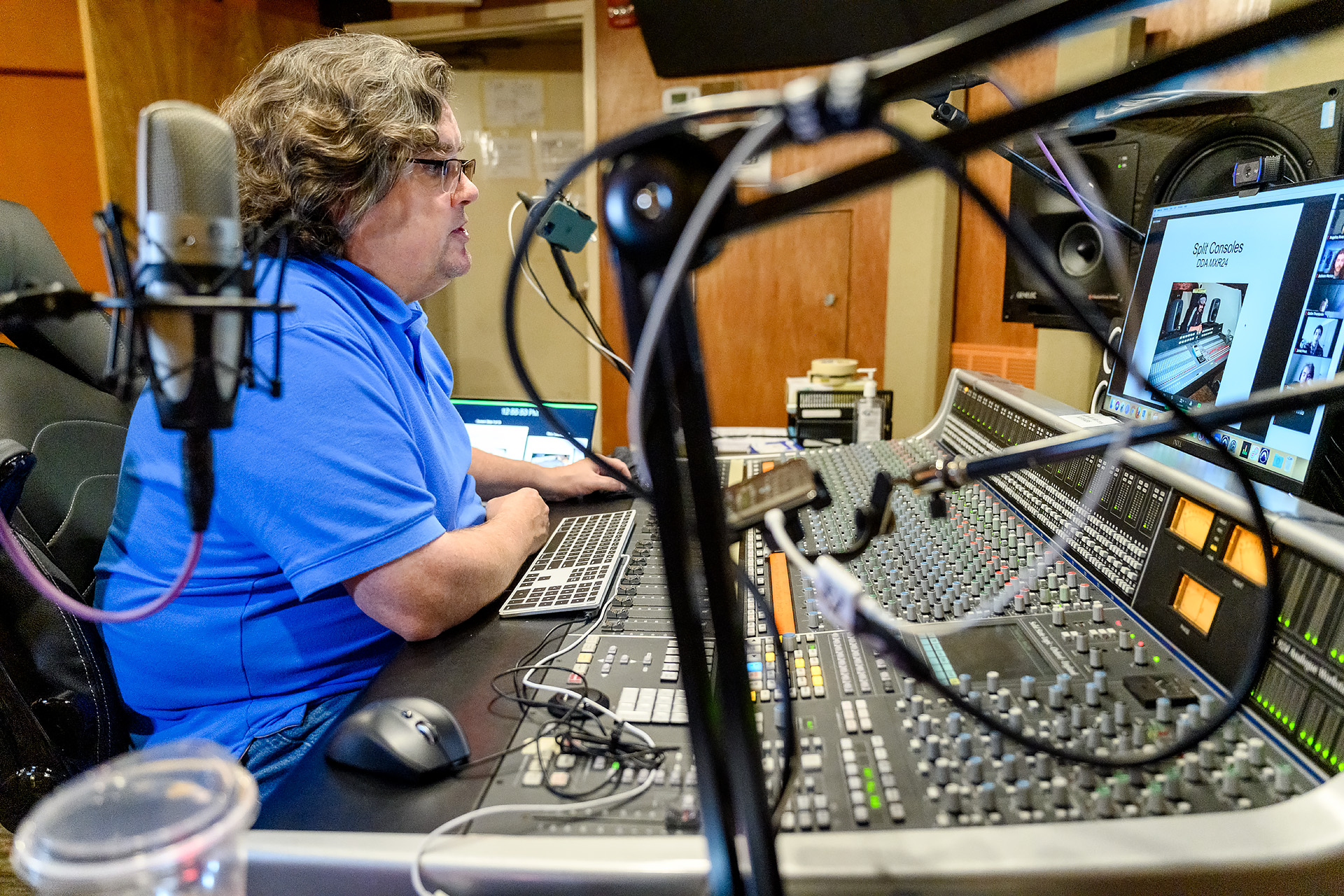 “Most of what I teach is hands-on,” Crabtree said. “Our students have to learn how all the equipment in the room works, how to collaborate with others in the control room, and how to work with musicians during a recording session. We knew right away when COVID hit that we’d need to make a virtual TV studio in the audio control room. We had to really scramble in the spring to figure it out quickly and muddle through—which we did.