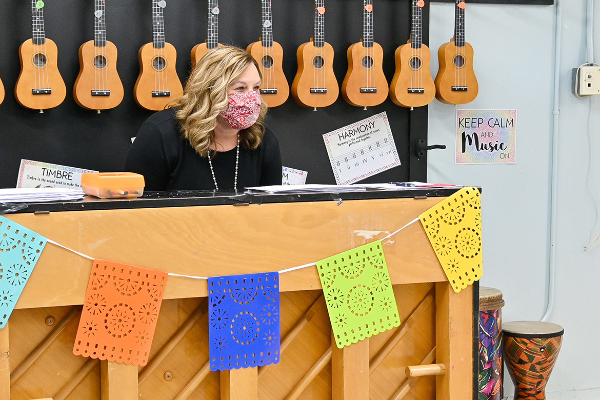 Stacy Ray, the music teacher at Homer Pittard Campus School, has an empty classroom while she fetches her next group of students in Murfreesboro, Tenn., on Nov. 4, 2020. (MTSU photo by Stephanie Barrette)