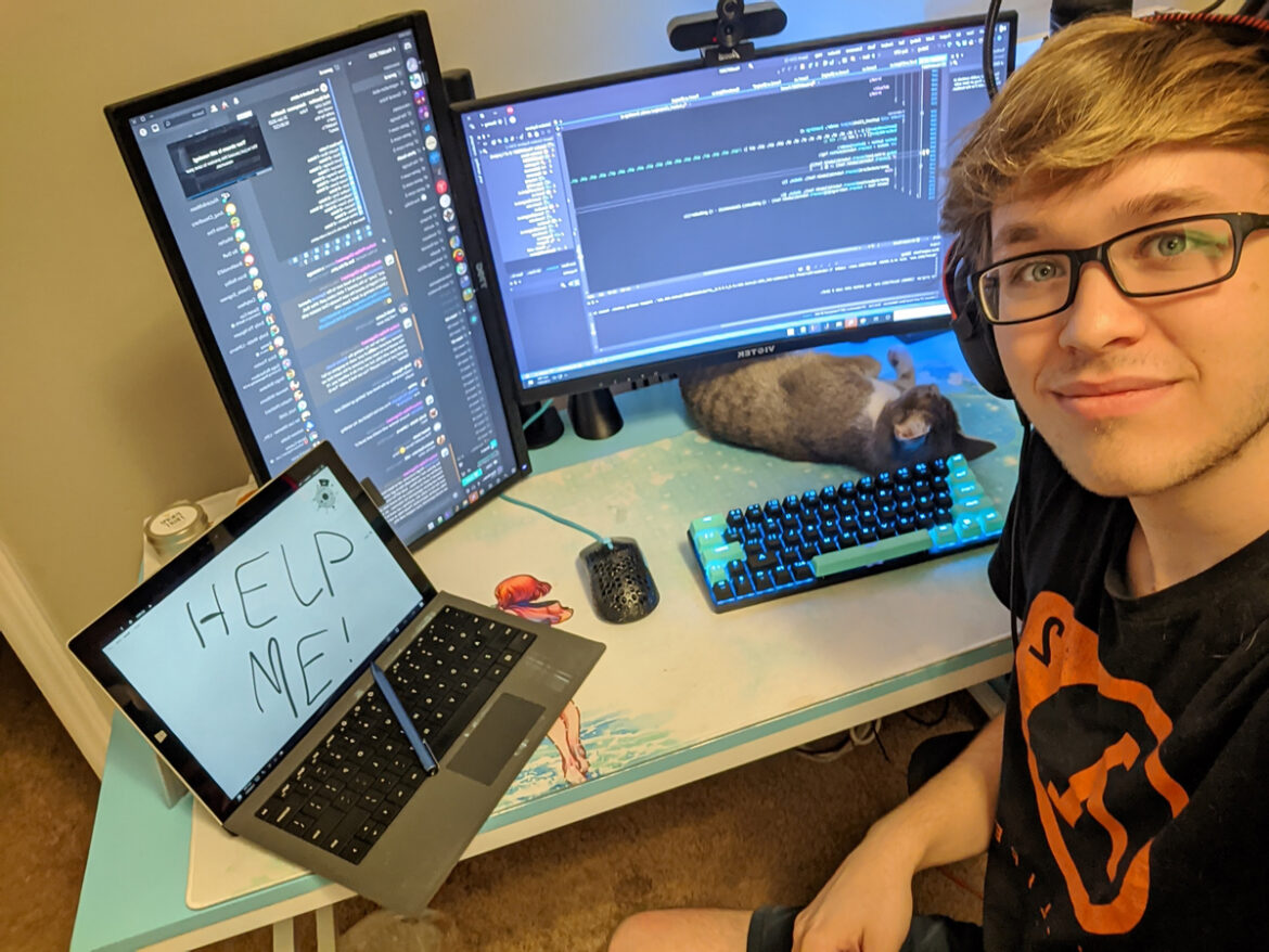 With a sleepy feline friend, team mascot Adora, keeping him company, MTSU HackMT participant Gage Richardson, 19, a sophomore computer science major from Lewisburg Tenn., awaits the resumption of the competition Saturday, Jan. 30. His team earned third-place honors and received the coveted Hacker’s Choice Award for the project “Are You Kitten Me: A Purr-ference Quiz” following the 36-hour virtual hackathon held Jan. 29-31. After programming for 20 straight hours, Richardson jokingly created the humorous “HELP ME!” message on his laptop. (MTSU photo submitted by Gage Richardson)