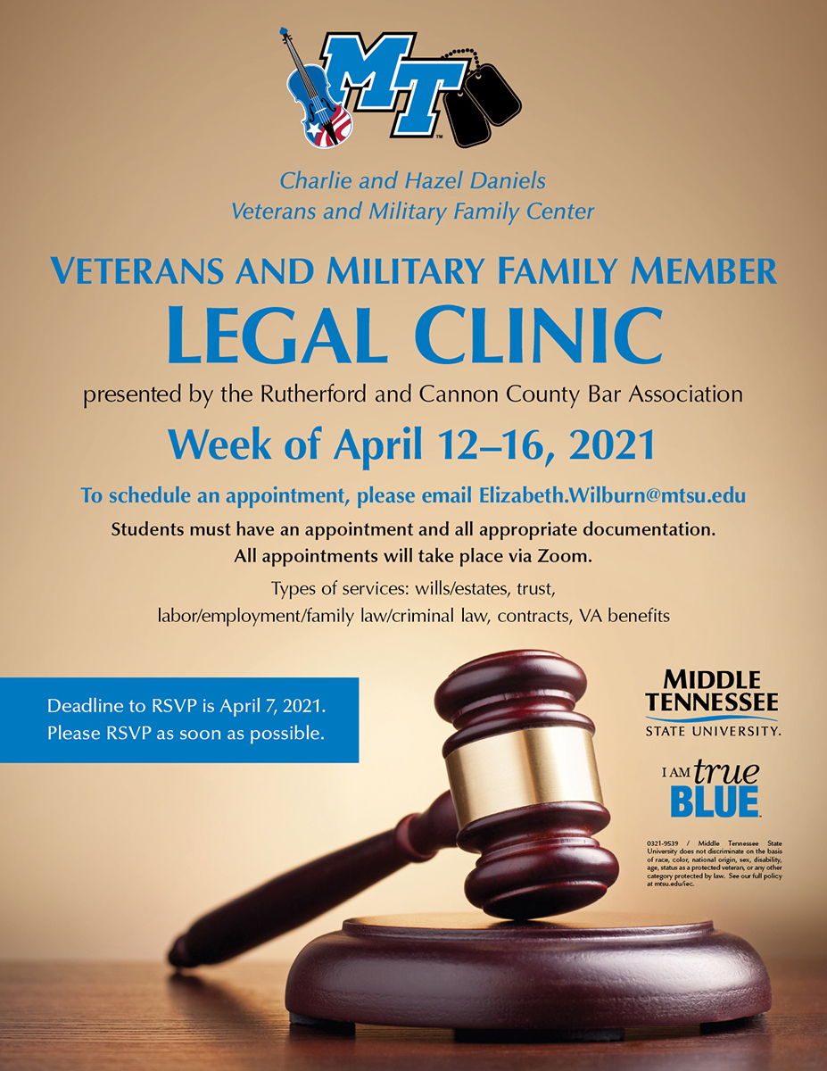 To schedule an appointment with a licensed attorney, email Elizabeth Wilburn (Elizabeth.Wilburn@mtsu.edu) in the Charlie and Hazel Daniels Veterans and Military Family Center by Wednesday, April 7.