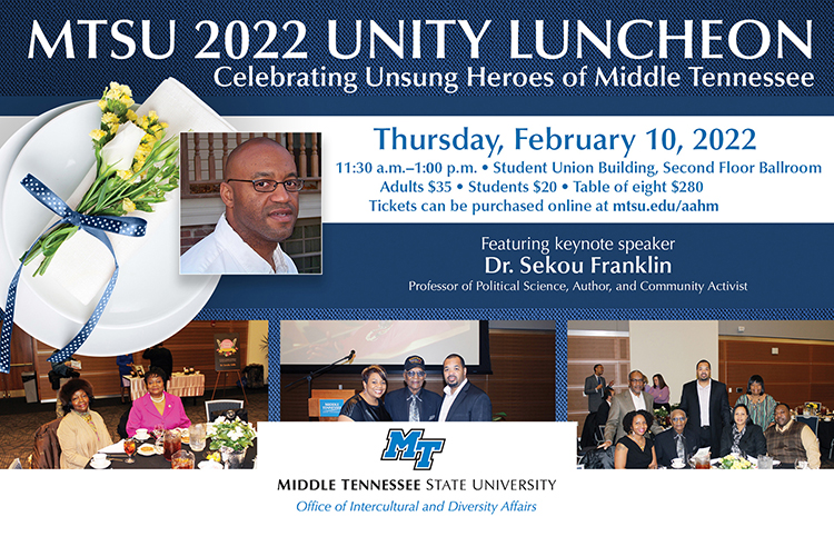 Keeping its familiar theme of “Where There Is Unity, There Is Strength,” the luncheon will feature keynote speaker Sekou Franklin, Ph.D., MTSU professor of political science and international relations and immediate past president of the National Conference of Black Political Scientists.