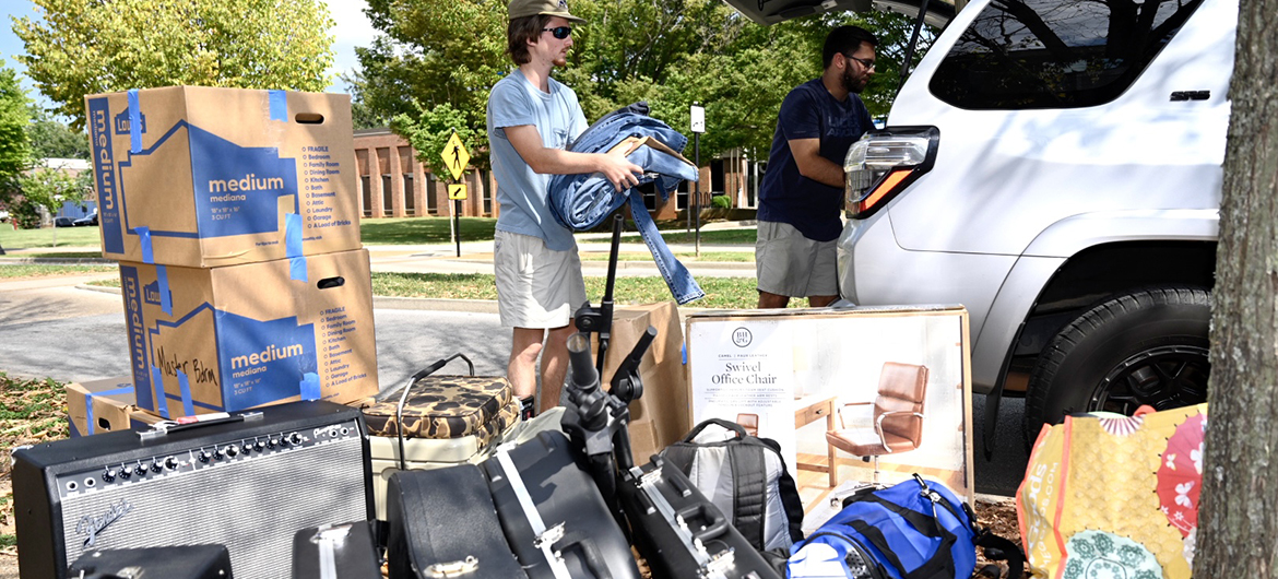 Family members and even new roommates helped Kailyn Tucker of Hollow Rock, Tennessee, Elijah Wiseman and Daniel Triggs Jr. of Memphis, Tennessee, and Kendall Durrill of Baltimore, Maryland, bring carloads of essentials — rugs, microwaves, flat-screen televisions, instruments, clothes and more — to their “new homes” in Corlew Hall for the next two semesters.