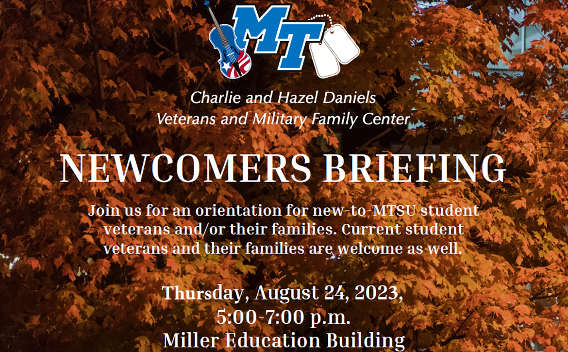 New and returning MTSU student-veterans and their families are welcome to attend a “Newcomers Briefing” hosted by the Charlie and Hazel Daniels Veterans and Military Family Center.