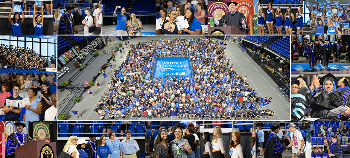 Convocation brings new freshmen and transfer students together with faculty and administrators wearing academic regalia in a formal program that also features the reading of the True Blue Pledge, led this year by Student Government Association President Michai Mosby, with remarks from MTSU President Sidney A. McPhee and Laurie Witherow, interim vice provost for Enrollment and Academic Services, and music from the Band of Blue.