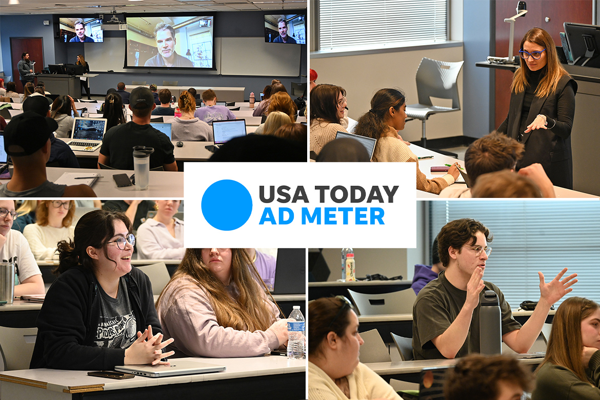 Almost 100 students in the Principles of Marketing class (MKT 3820) and Retailing (MKT 3830) taught by Gaia Rancati, assistant professor of marketing and neuromarketing, participated in the inaugural USA Today-Ad Meter college/university spotlight program to capture the impressions of college-aged students of the multimillion-dollar advertisements rolled out before and during the telecast of Super Bowl 58.