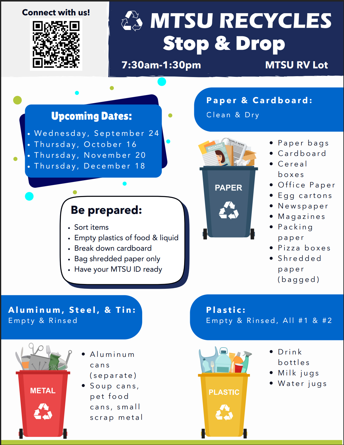 In addition to the event on Sept. 24, MTSU Recycling Stop and Drop will be held in the same location and time frame on these upcoming dates: Thursdays on Oct. 16, Nov. 20 and Dec. 18. There is no charge to participate.