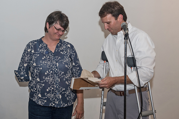 Murfreesboro City Council member Rick LaLance, right, presents the key to the city of Murfreesboro to MTSU alumna Alicia Adkerson, widow of Nashville Scene editor Jim Ridley, at the July 14 celebration fundraiser in Nashville to benefit Ridley’s scholarship fund through the MTSU College of Media and Entertainment. (Photo by Eric England/The Nashville Scene)