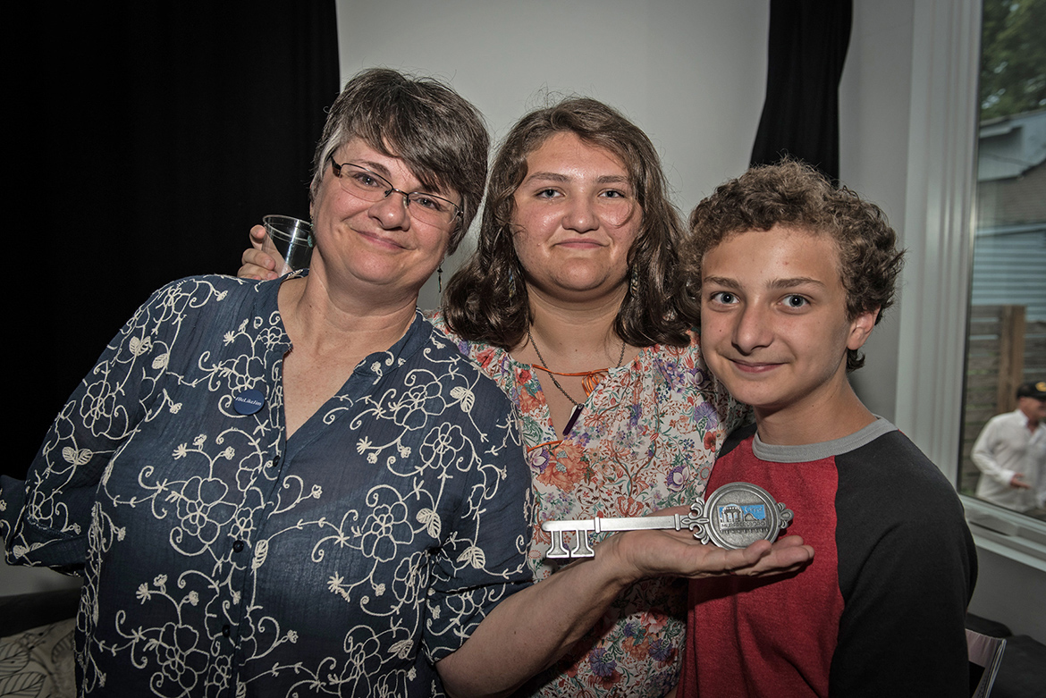 MTSU alumna Alicia Adkerson, left, the widow of Nashville Scene editor Jim Ridley, and the couple’s children, Kat and Jamie Ridley, pose with the key to the city of Murfreesboro at the July 14 celebration fundraiser in Nashville to benefit the Jim Ridley Memorial Scholarship fund in the MTSU College of Media and Entertainment. (Photo by Eric England/The Nashville Scene)