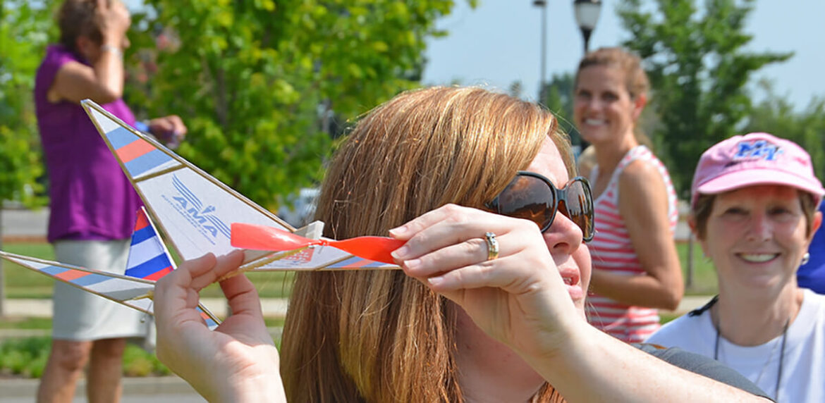 A Midstate K-12 teacher prepares to send her rubber band-propelled airplane into the air during a prior aerospace education graduate course held on campus and at the MTSU Flight Operations Center at Murfreesboro Airport. (MTSU file photo by Randy Weiler)