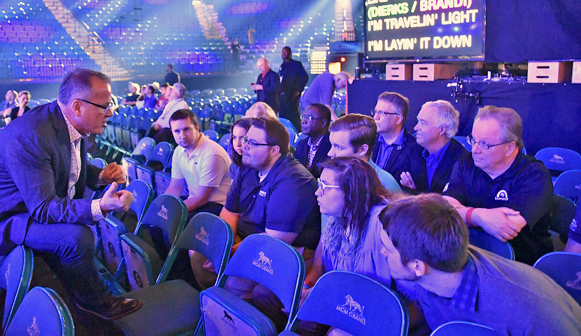Academy of Country Music CEO and MTSU alumnus Pete Fisher, left, speaks with students from MTSU’s College of Media and Entertainment as part of a learning lab at the 54th ACM Awards held Sunday, April 7, in Las Vegas. Listening behind the students are MTSU President Sidney A. McPhee and other members of the university’s delegation. (MTSU photo by Andrew Oppmann)