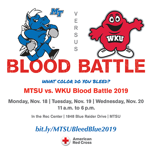 For updates and more information about the blood drive, follow @MTSUNews on Twitter with the hashtags #BleedBlueMTSU and #BleedBlueBeatWKU.