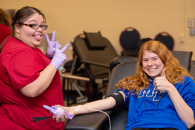Avery Garfield, right, a sophomore nursing major, cuts up with an American Red Cross blood services technician while donating blood Feb. 10 in MTSU’s Keathley University Center during the university’s 2020 valentine blood drive. (MTSU photo by James Cessna)