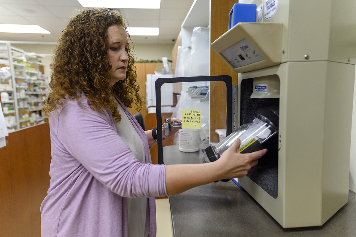 With a pneumatic tube, MTSU Pharmacist Tabby Ragland sends medications to a customer at the Campus Pharmacy drive-thru, which is a social distancing option so students, faculty and staff do not have to enter the Student Health, Wellness and Recreation Center on the east side of campus. The drive-thru is open from 8 a.m. to 4:30 p.m. Monday through Friday. (MTSU photo by J. Intintoli)