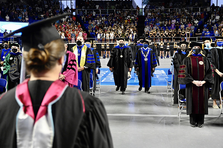 Led by Debra Sells, vice president for Student Affairs and vice provost for Enrollment and Academic Services, University Convocation officially welcomes freshmen and transfer students to the Blue Raider campus for a new academic year. The formal ceremony features a keynote speaker as well as MTSU President Sidney A. McPhee, Provost Mark Byrnes and other faculty and top administrators marching into the arena in full academic regalia.
