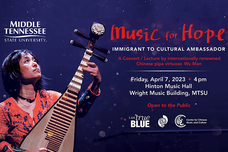 World-renowned pipa virtuoso and cultural ambassador Wu Man will bring the gift of Chinese music and culture to Middle Tennessee State University on Friday, April 7, when she presents “Music for Hope,” a free public concert and lecture.