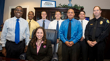 MTSU President Sidney A. McPhee, shown at left in the photo above, welcomes six newly commissioned police officers to the university July 1 after a..