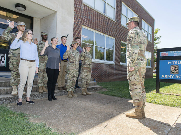 MTSU’s Military Science Program ushered in the fall 2018 semester with a brief formal swearing-in ceremony, as eight newly contracted students took their oaths Thursday, Aug...
