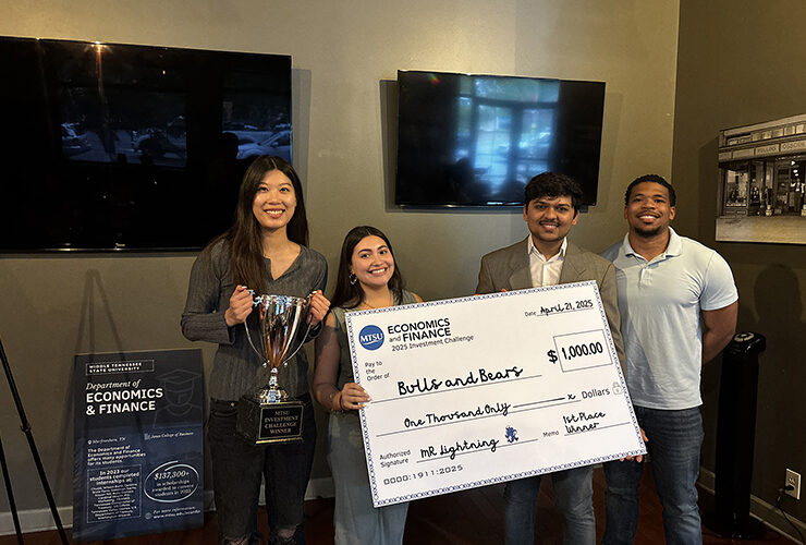 Student News MTSU business clubs award students for tackling real-world ‘investment challenge’ by Jordan Reining May 14 2025 SHARE Facebook Twitter Pinterest Middle Tennessee State University’s Investment Club and Economics Club concluded their first ‘investment challenge’ with an awards ceremony that included scholarship prizes to the top.. Read More →