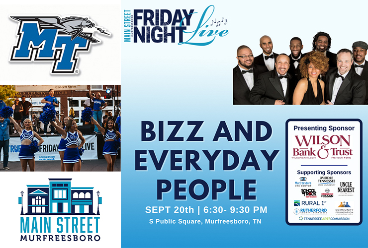 Main Street Murfreesboro‘s final 2018 “Friday Night Live” concert series in downtown Murfreesboro will feature a heavy dose of True Blue energy. Middle Tennessee State..