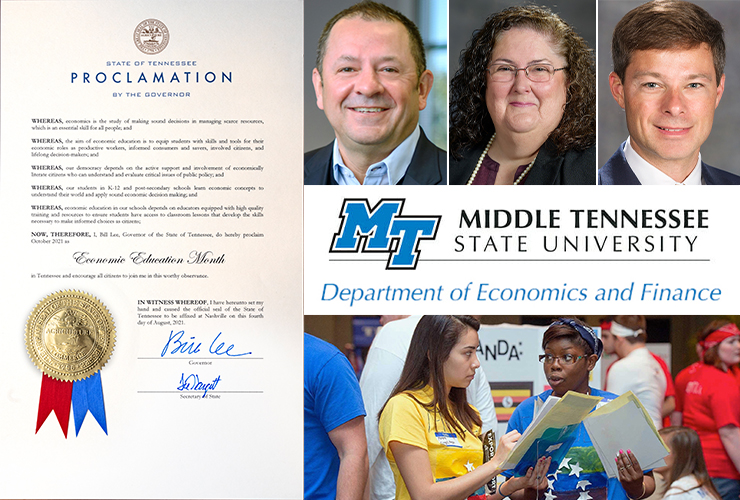 Faculty/Staff News MTSU council applauds governor’s nod to importance of economics education by Jimmy W. Hart October 4 2021 SHARE Facebook Twitter Pinterest Gov. Bill Lee signed a proclamation earlier this year that recognizes October as Economic Education Month in Tennessee. The designation was petitioned for by the.. Read More →