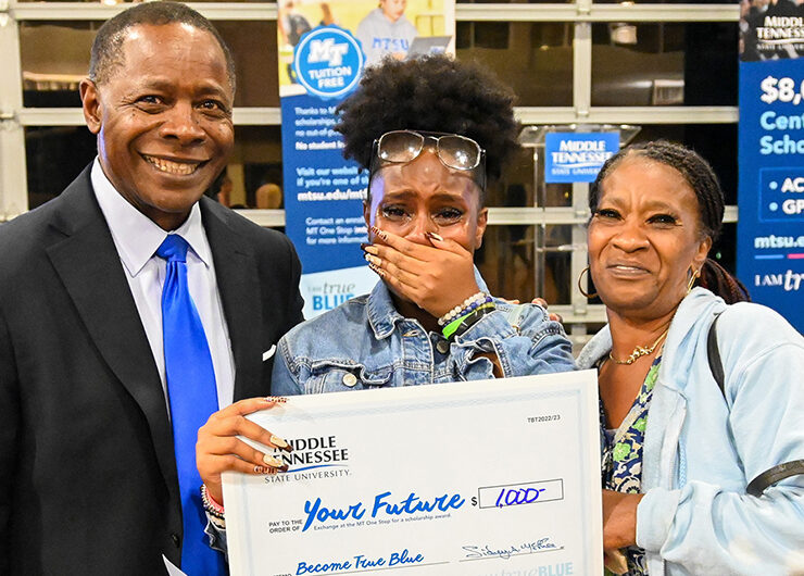Olivia Porter, senior at Kenwood High School in Clarksville, Tennessee, was overcome with emotion when she received a surprise scholarship from MTSU President Sidney A. McPhee at..