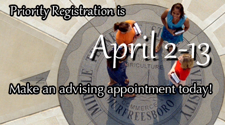 MTSU students can make sure they get the classes they need for summer and fall 2012 by registering during the University’s “Priority Registration” period April..