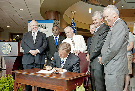 Gov. Bill Haslam signed the Tennessee Education Lottery Scholarship Bill June 8 on the MTSU campus, a measure that will allow college students across the..